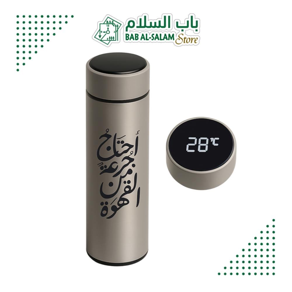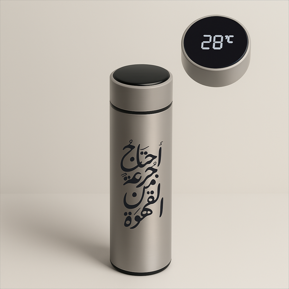 مج حراري بشاشة ديجيتال فاخر بلون فضي أنيق، مزوّد بشاشة لمس رقمية توضح درجة حرارة مشروبك لحظة بلحظة